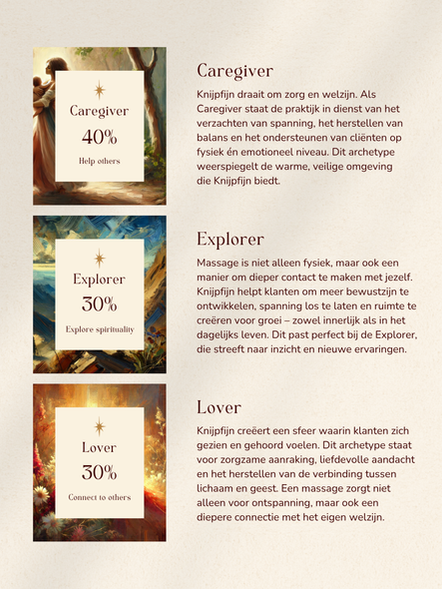 Een stralende branding die rust en warmte uitstraalt. Het mag een vrouwelijke touch hebben zonder te braaf te zijn. De archetypes, caregiver, explorer en lover, stralen dit ook uit. Verzorgend, vrijheid en liefde voor het lijf en onze ware staat van zijn: geheel ontspannen.
